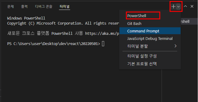 실습을 위해 현재 터미널이 powershell인지 확인하자. powershell이 아니라면 변경해주자.
