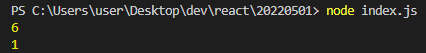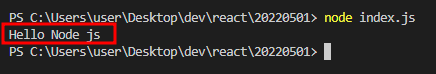 위의 명령어를 터미널에 입력하면 아래 사진처럼 index.js 파일이 실행된 걸 볼 수 있다.