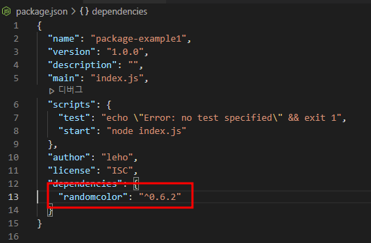 패키지를 추가할 때마다 저 부분에 변경이 일어난다. randomcolor의 버전을 보면 '^'이게 하나 붙어있는데 이건 이 패키지를 설치할 때 이 패키지의 버전을 정확히 명시하는 게 아니라 0.6.2 버전 이상으로만 설치가 된다라는 뜻이다.