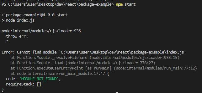 에러가 난다. 에러가 나는게 당연하다. 왜냐면 index.js 파일이 없기 때문이다^^. ㅎㅎ index.js 파일을 생성해주자. index.js 파일을 생성하고 consoel.log("hello node.js package");를 입력 후 아까 npm start 명령어를 다시 입력해보자.