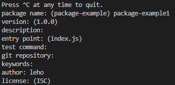 npm init을 입력하면 갑자기 인터뷰를 당하게 되는데 여기에서 놀라지말고 입력하거나 엔터를 눌러 넘어가면된다.
