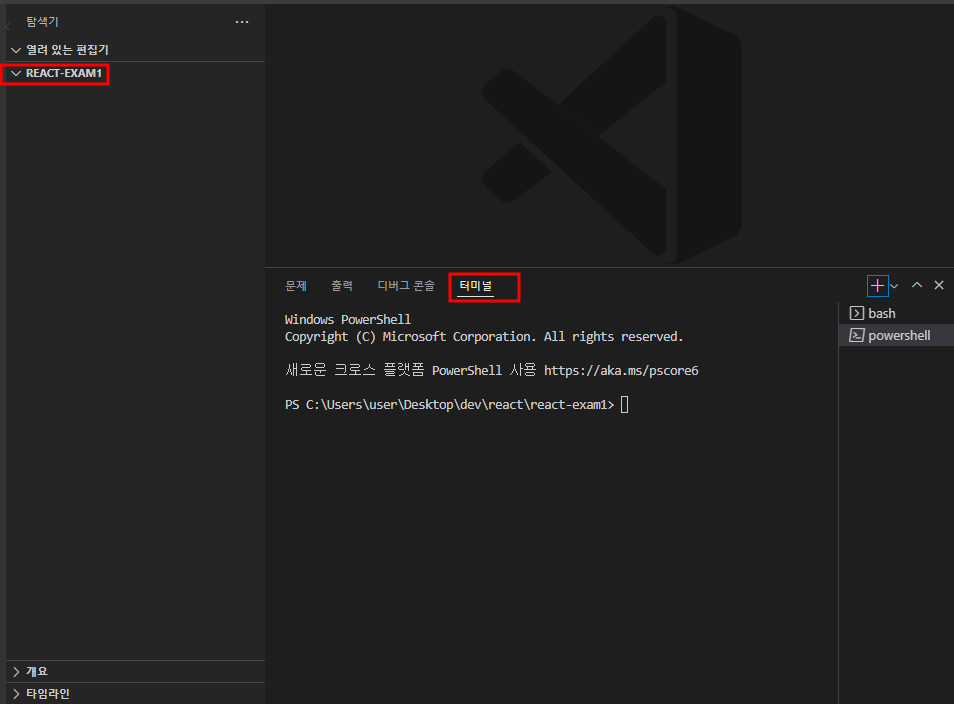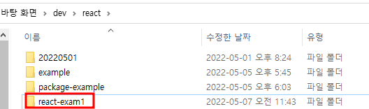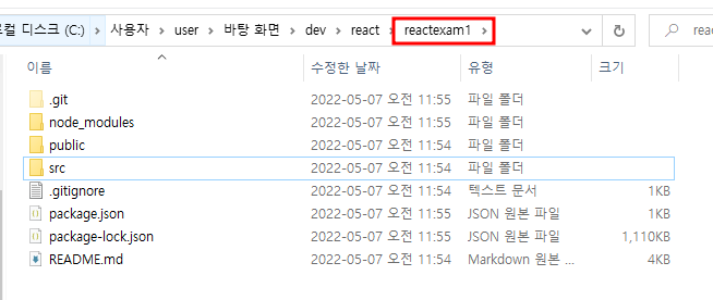 설치가 완료되었다면 reactexam1 폴더가 생겼을 것이다. 그 폴더를 우클릭해서 파일 탐색기를 열어주면 파일 탐색기에서 해당 파일들을 볼 수 있다. 알고 보니 나는 폴더 이름을 react-exam1로 했는데 강의에서는 reactexam1로 되어있어서 폴더명을 reactexam1로 변경했다. 그러면 파일 경로가 C:\Users\user\Desktop\dev\react\reactexam1\reactexam1이 된다. reactexam1\reactexam1은 이상하니까 프로젝트 파일을 모두 드래그해서 컨트롤+X로 잘라내기 한 다음 그 상위 폴더에 붙여 넣고 빈 폴더가 된 제일 하위 폴더인 reactexam1은 삭제하자.