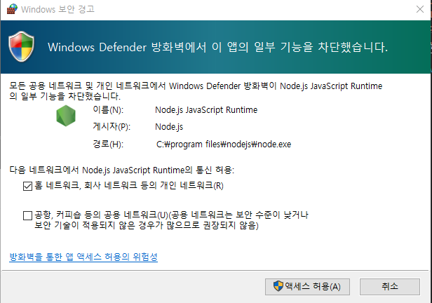 뭔지 모르겠지만 ㅎㅎ 액세스 허용 버튼을 눌러준다. 취소하면 뭔가 실행이 안될 것 같다.