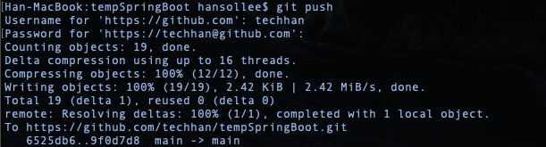 그리고 터미널에서 다시 git push를 입력하면 깃허브 아이디(닉네임)과 비밀번호를 입력하라하는데 비밀번호를 입력하라할 때 복사한 토큰 값을 붙여서 엔터를 치면 이제 다시 정상적으로 git을 이용할 수 있다.