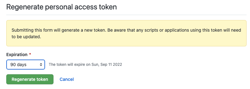 원하는 기간을 선택하고 Regenerate token을 누르면 된다. 발급이 완료되면 token 키를 보여주는데 잃어버리면 또 발급받아야하니 복사해서 어딘가에 붙여두자.