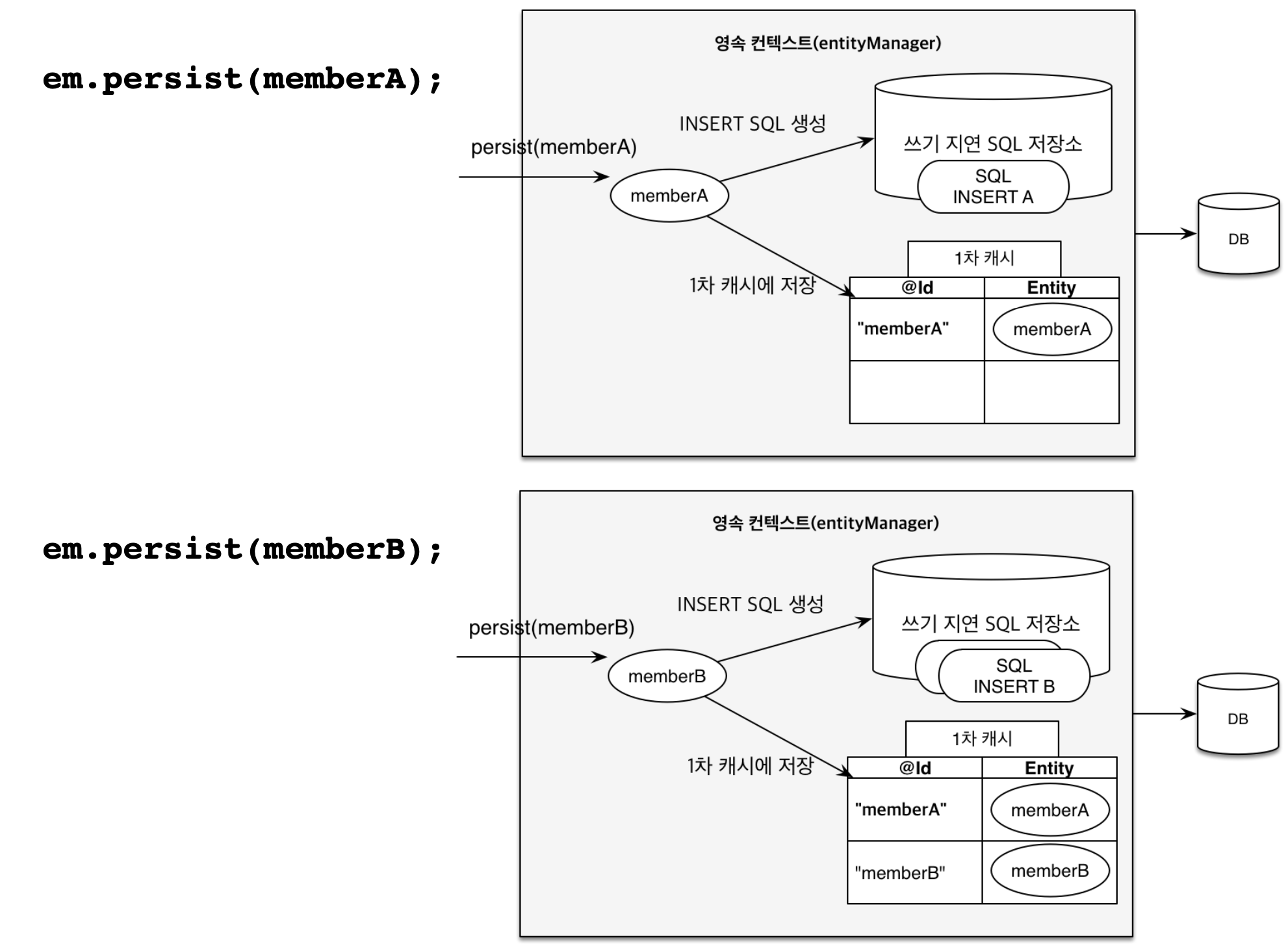 - 영속성 컨텍스트는 1차 캐시 공간과 쓰기 지연 SQL 저장소를 가지고 있다. 쓰기 지연 SQL 저장소는 DB에 등록해야 될 엔티티 객체에 대한 INSERT 쿼리를 저장해둔다.