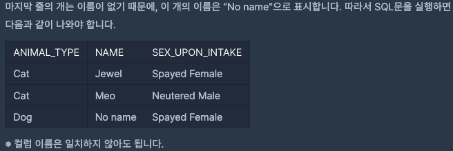 SELECT ANIMAL_TYPE, IFNULL(NAME, "No name") as NAME, SEX_UPON_INTAKE FROM ANIMAL_INS