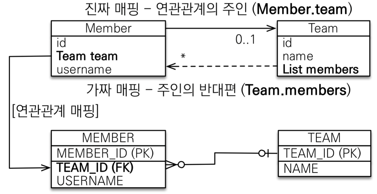 Team을 주인으로 정하면 Team의 객체를 등록 및 수정 등의 SQL 쿼리 문이 발생하면 MEMBER Table에 SQL문이 적용되는 것이다. 이러면 JPA를 사용하면서 혼선이 잦아질 것이다. 그러므로 되도록 외래키가 있는 테이블을 객체화한 객체를 주인으로 정하면 된다.