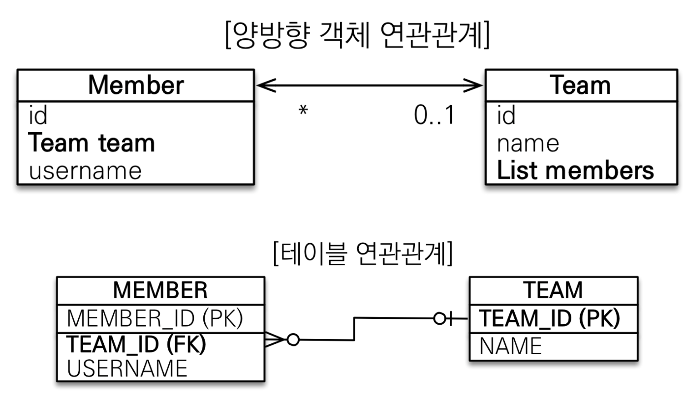 초반에서도 말했지만 DB 테이블의 경우엔 외래키 하나로 두 테이블을 양방향 관계로 만들 수 있다. 외래키 하나로 Member나 Team 테이블의 데이터를 자유롭게 양쪽에서 JOIN 해서 가져올 수 있기 때문이다. 그에 반해 객체 연관관계는 그냥 단방향 두 개를 서로 잘 묶어서 양방향처럼 보이게 한다. 즉 양방향 관계를 만들려면 각 객체 테이블의 상대 객체 테이블을 참조할 수 있는 코드를 작성해야 한다는 것이다.