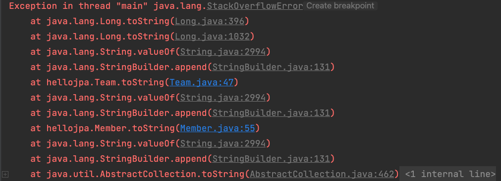 toString()이 왜 문제가 되냐면 Member 클래스의 toString()에서는 team을 출력한다. 즉, team.toString()과 같은 코드이다. 또 Team 클래스에서는 members를 출력한다. 컬렉션은 또 컬렉션 안에 있는 요소마다 toString()을 호출한다. 그래서 양쪽에서 toString() 무한 호출하면서 나타나는 장애이다.