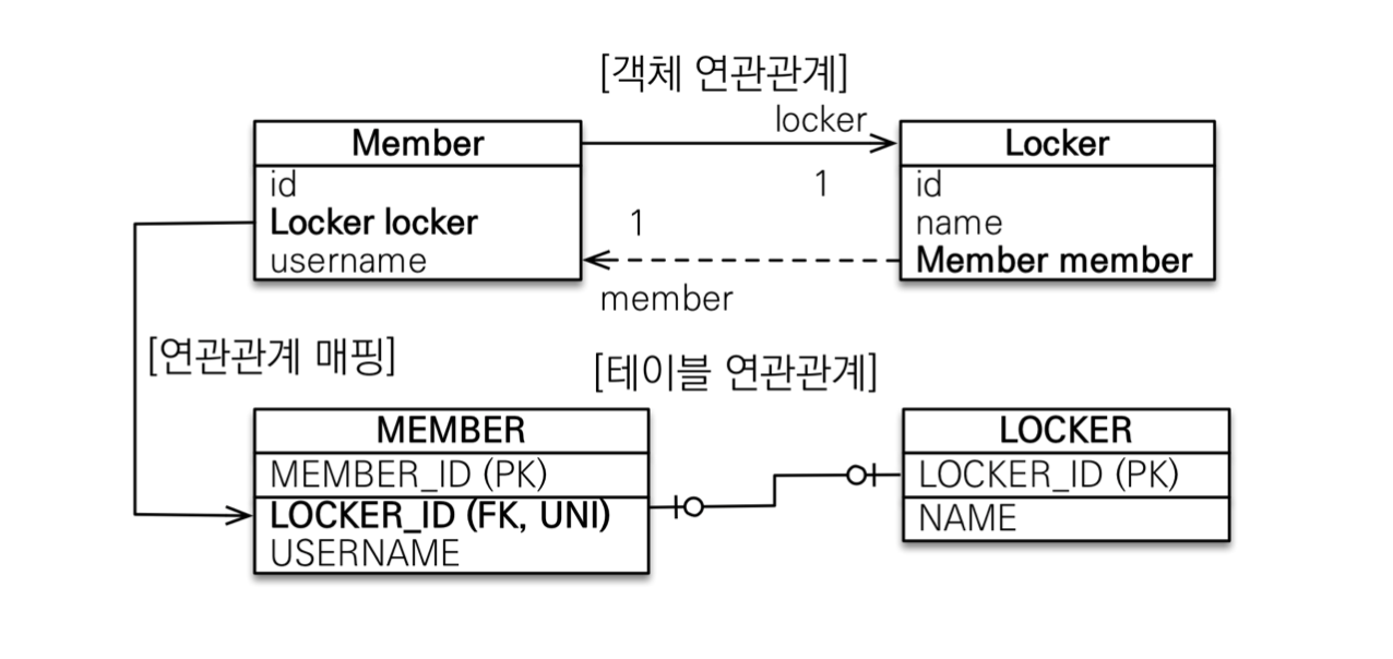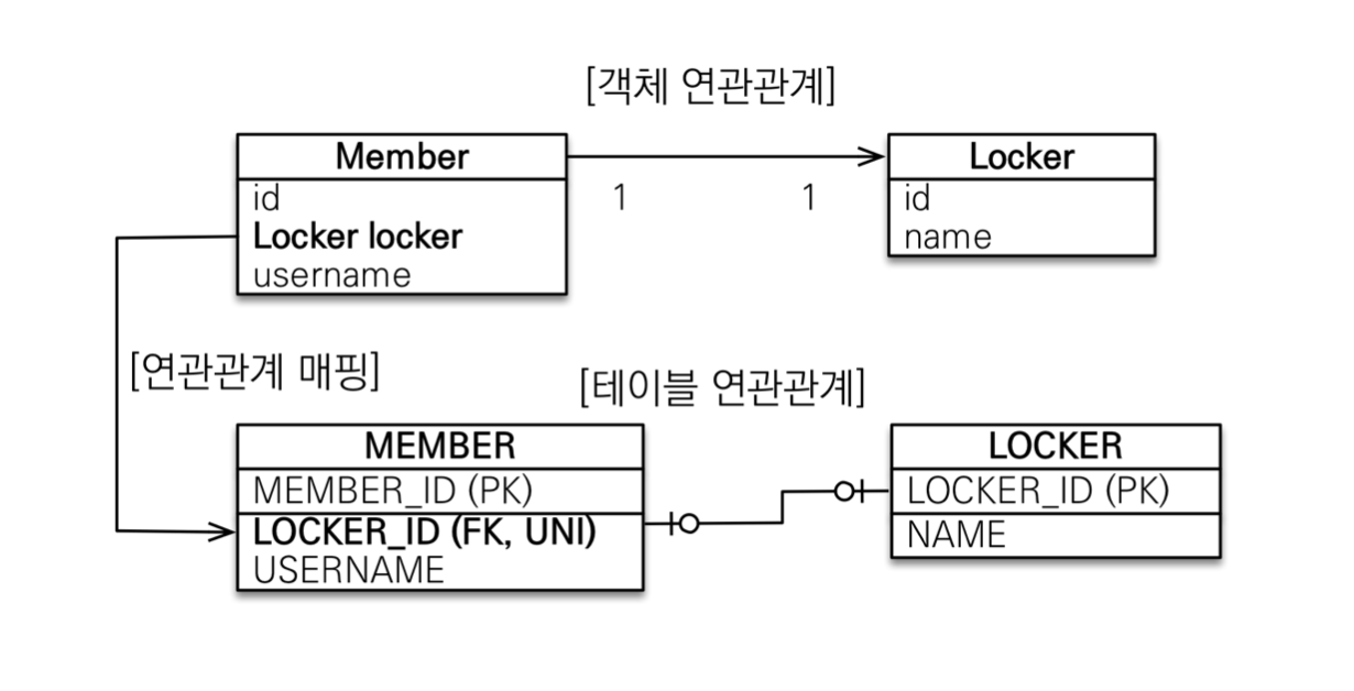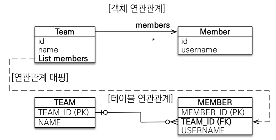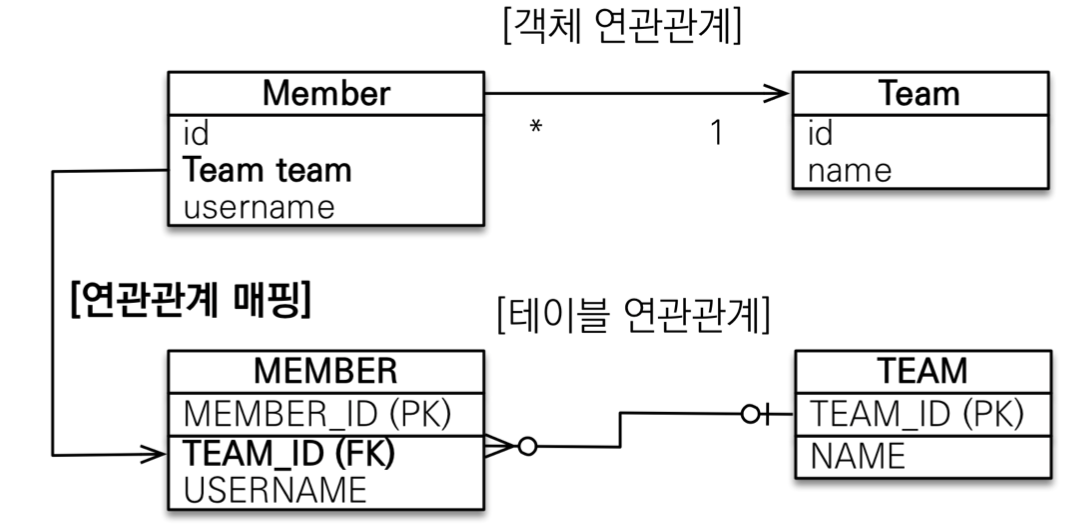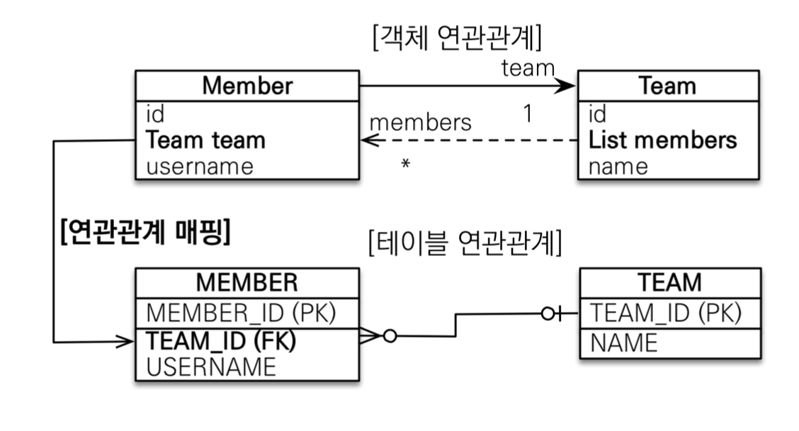- 테이블은 외래키 하나로 두 테이블이 연관관계를 맺음
