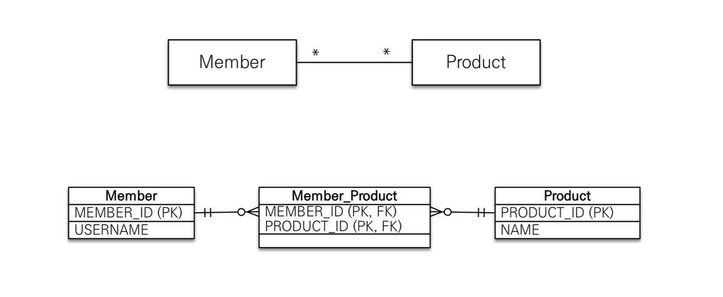 - 관계형 DB는 정규화된 테이블 2개로 다대다 관계를 표현할 수 없다.