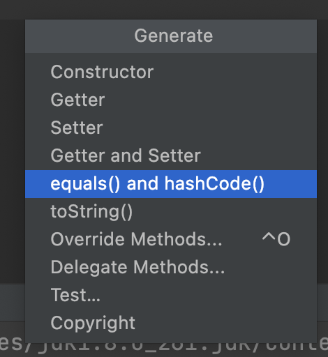 mac 기준 Control + N 후 equals() and hashCode() 선택