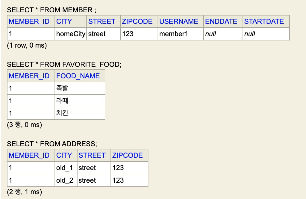 그래서 컬렉션 값 타입 데이터를 가져와야 할 때는 favorite_food 테이블이나 Address 테이블에서 SELECT 하는 쿼리가 발생하면 가져온다. 이는 Address 뿐만 아니라 favorite_food 테이블에도 동일하게 적용된다.