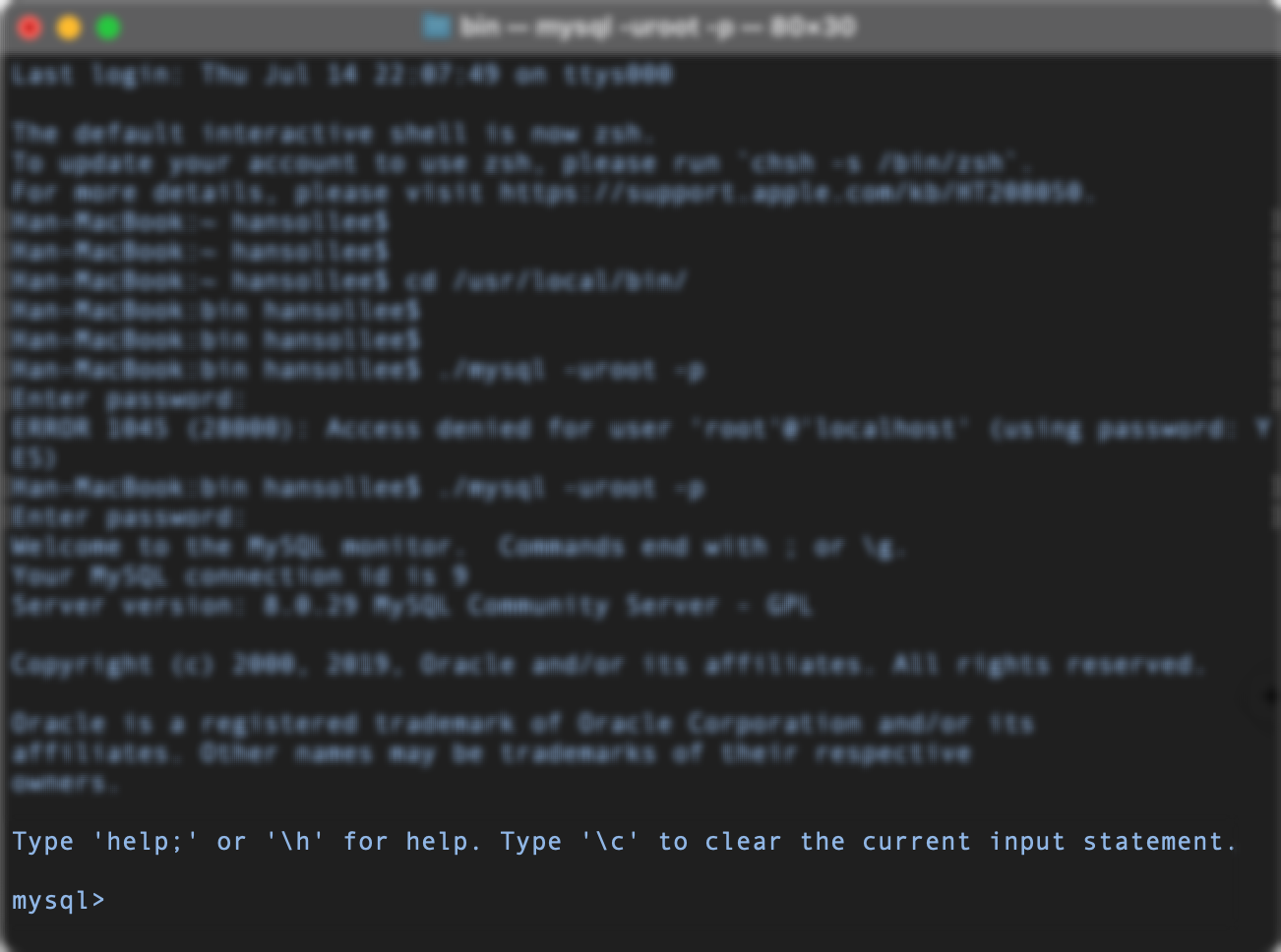 터미널 맨 마지막에 mysql> 이라 변경되면 로그인까지 성공한 것이다.