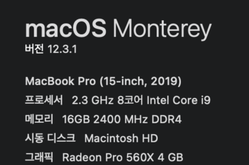 - 2019년도에 산 15인치 맥북 프로 인텔 CPU이다.
