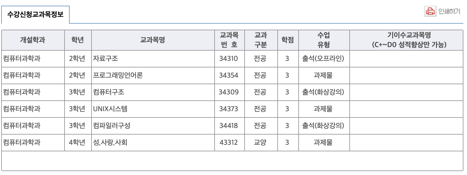 대망의 수강신청 날. 과목이 뭐 뭐 있는지나 구경해보자 하고 들어가 놓고는 어느새 수강신청을 하고 있는 나를 보았다.... 게다가 6과목이다..ㅎ 과목을 보니 또 듣고 싶은 욕구가 올라와버린 것이다. 그래서 그냥... 하기로 했다. 솔직히 뭐 할 일들은 언제나 있을 테고, 지금 와서 휴학하면 나중에도 휴학을 뭔가 뺸질나게 할 수 있을 거 같아 킵 고잉 하기로 했다. 구구절절했지만 그래서 결론적으로 내가 수강 신청한 과목들은
