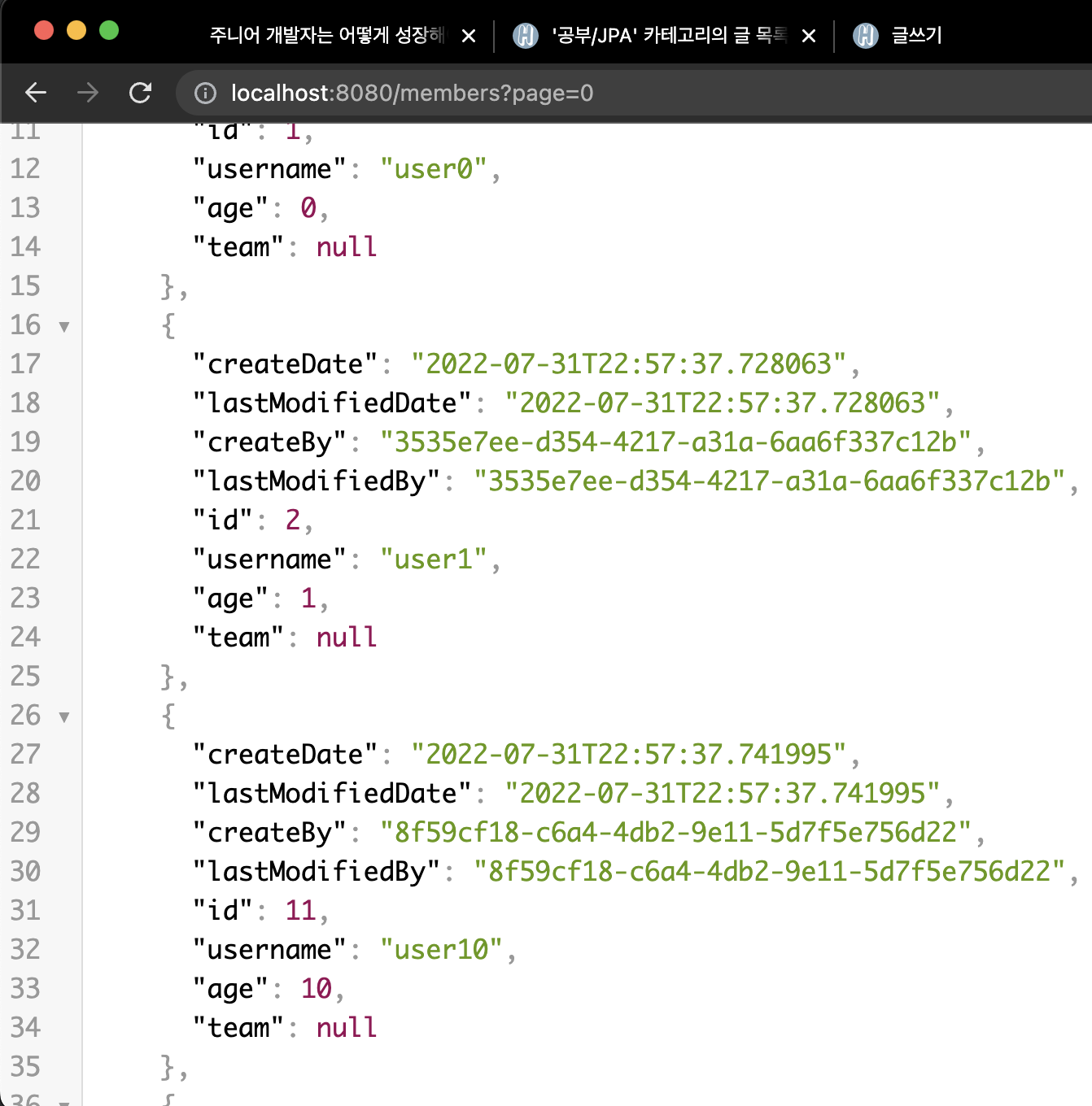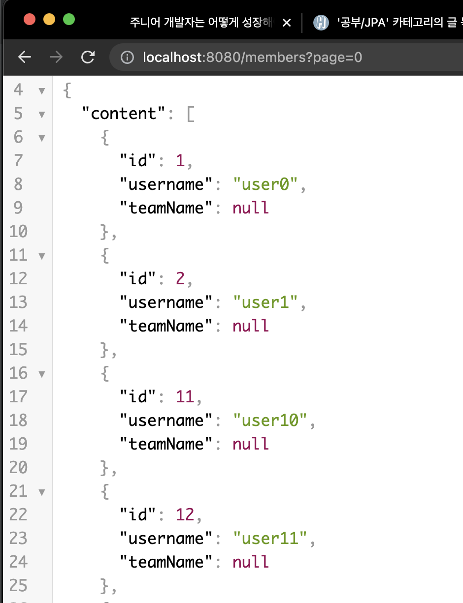 global 설정보다 개별 설정이 더 우선순위가 높다. 주소창에 page=0으로 입력하면 username이 오름차순으로 5개의 데이터가 출력된 걸 볼 수 있다.