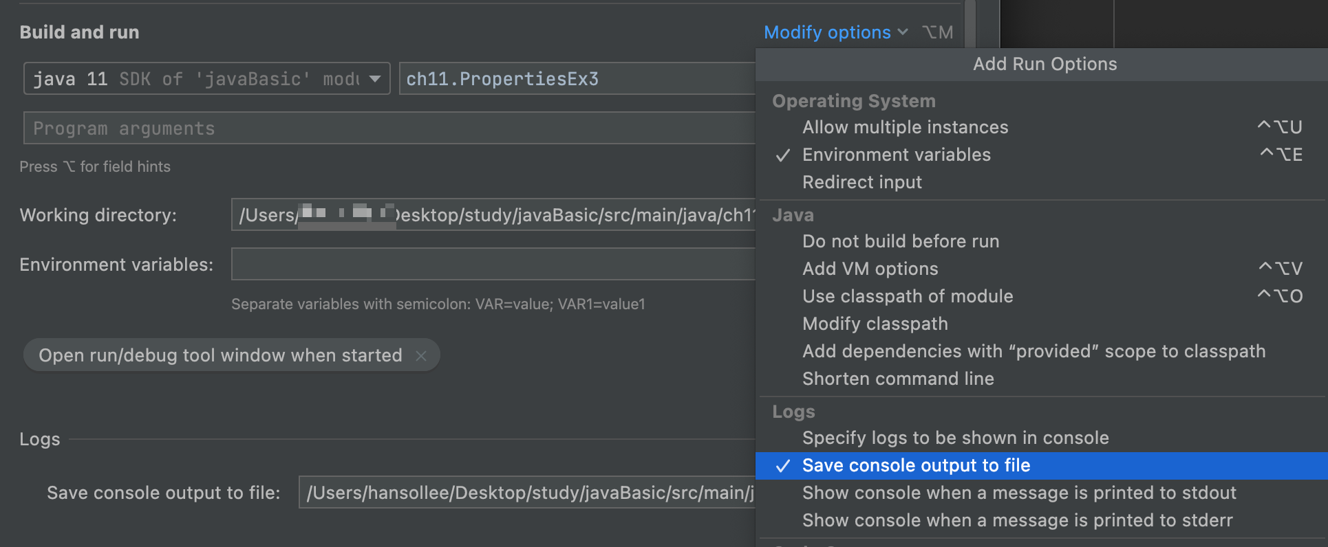 - Build and run 우측 부분에 Modify options > Save console output to file