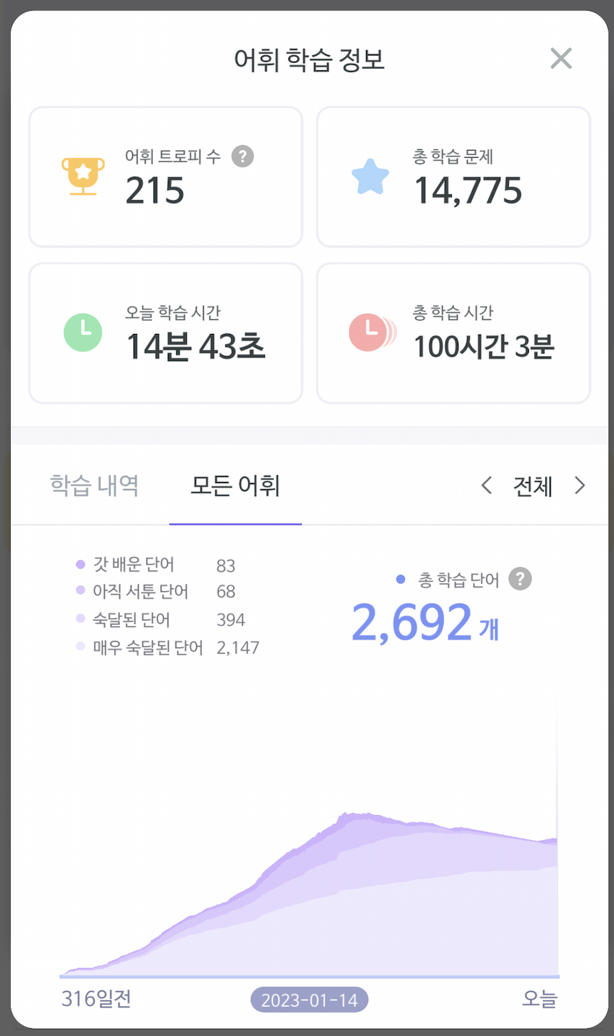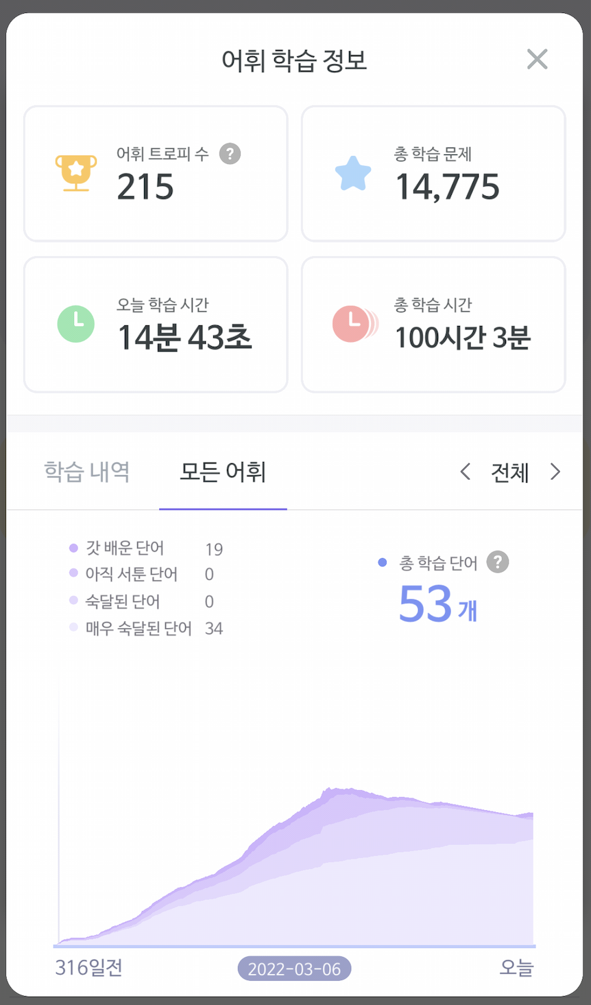 말해보카를 열심히 한 만큼 어휘 학습 정보도 눈에 띄게 많이 올랐다.