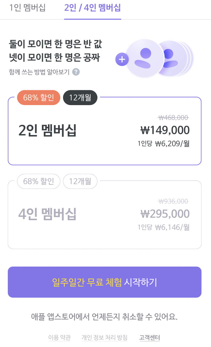 2인 멤버십의 경우 한명당 74,500원을 지불하면 1년을 사용할 수 있다.