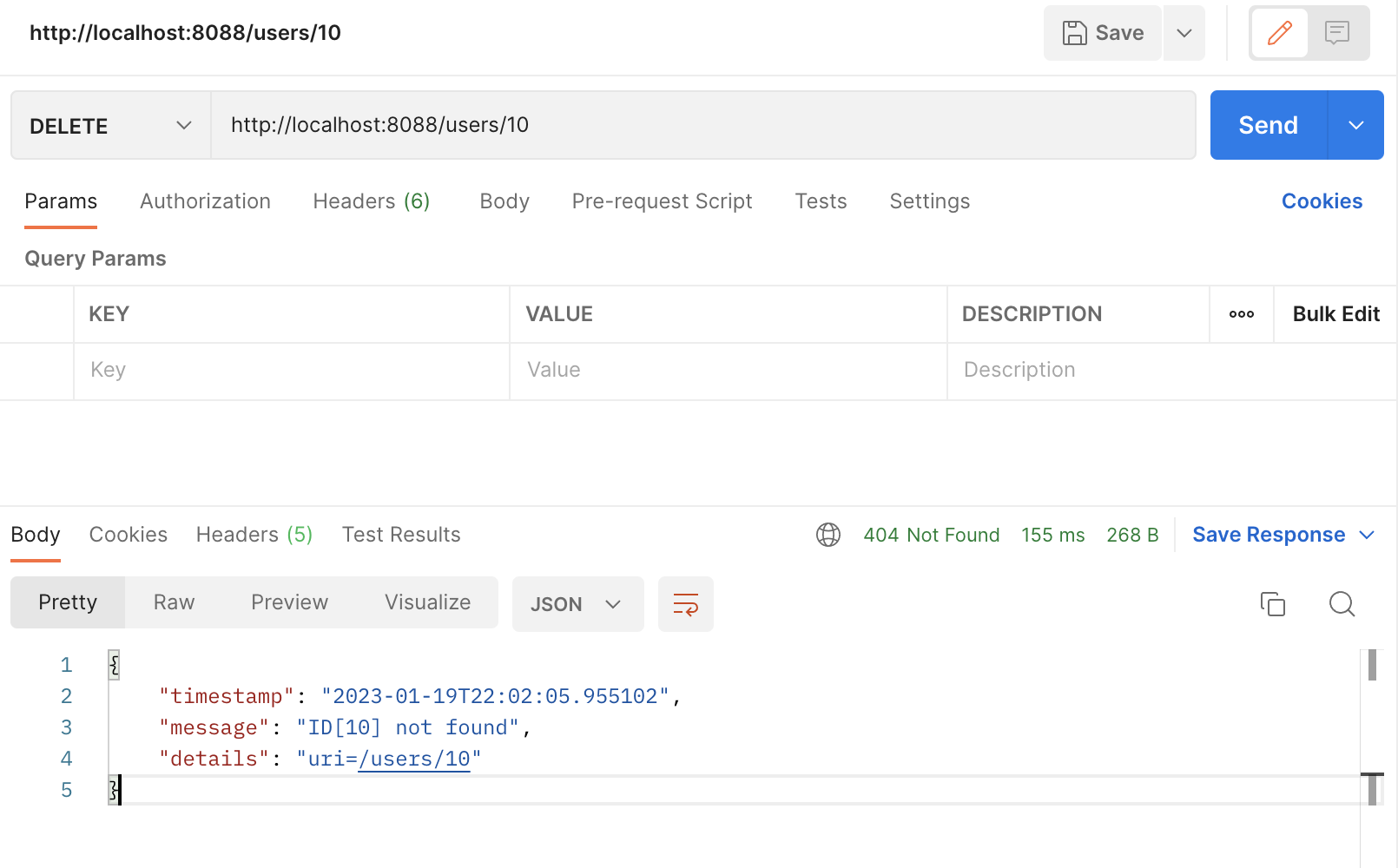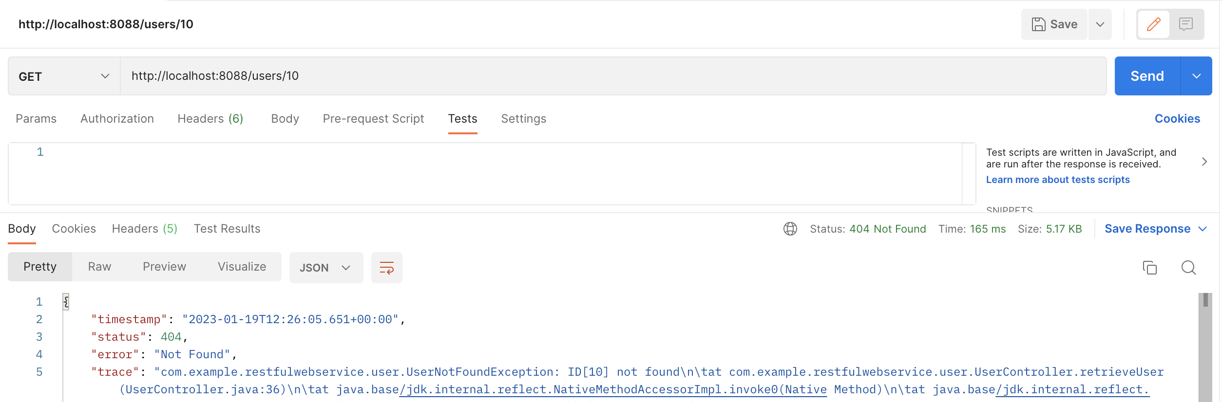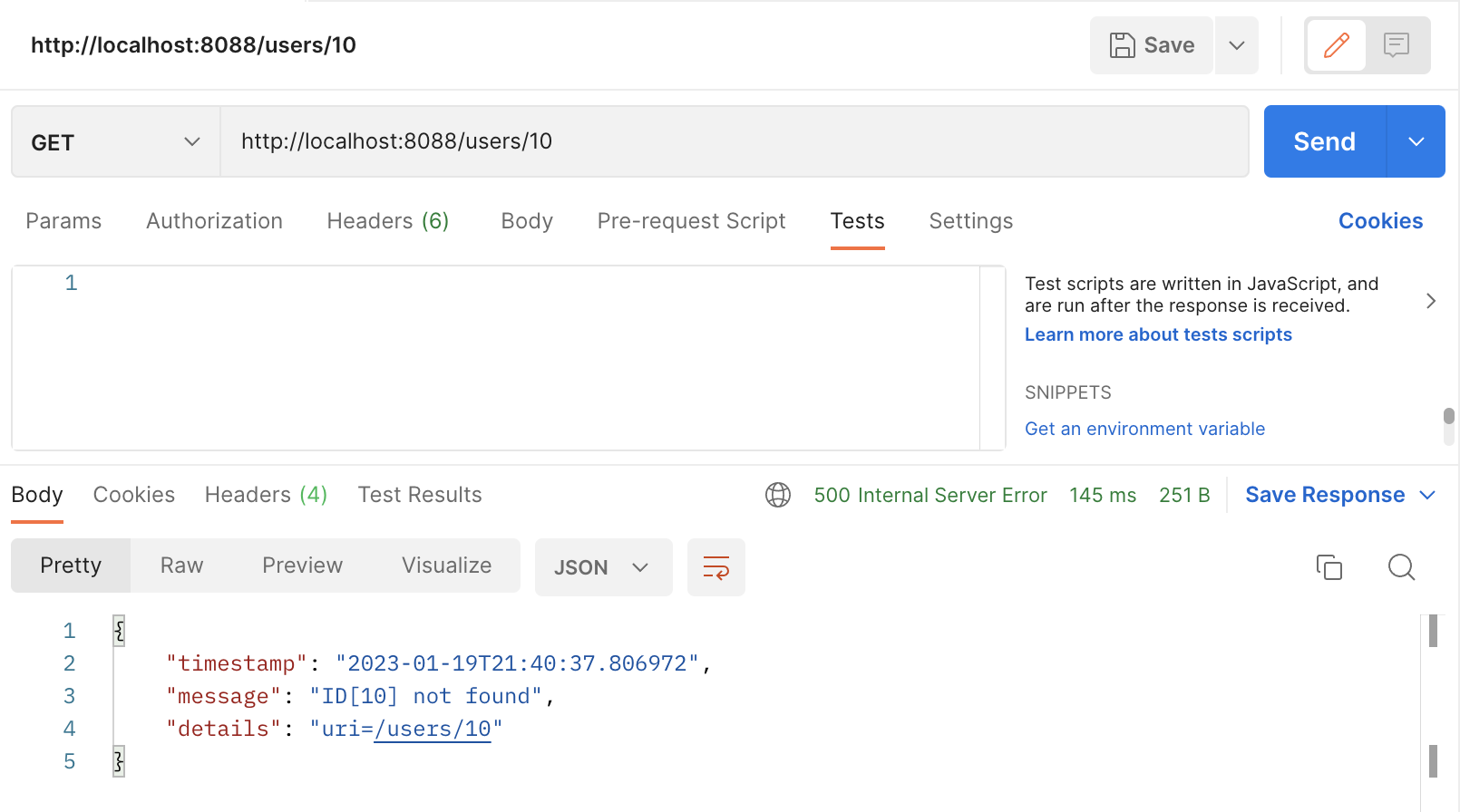 Status code가 500으로, server에서 발생된 에러 코드라 적혀있다. 지금 발생시킨 에러는 서버에서 잘못 처리된 것이 아니라 적절하게 처리된 것으로 결과 값을 찾을 수 없다는 예외 코드(404)로 변경해주자.