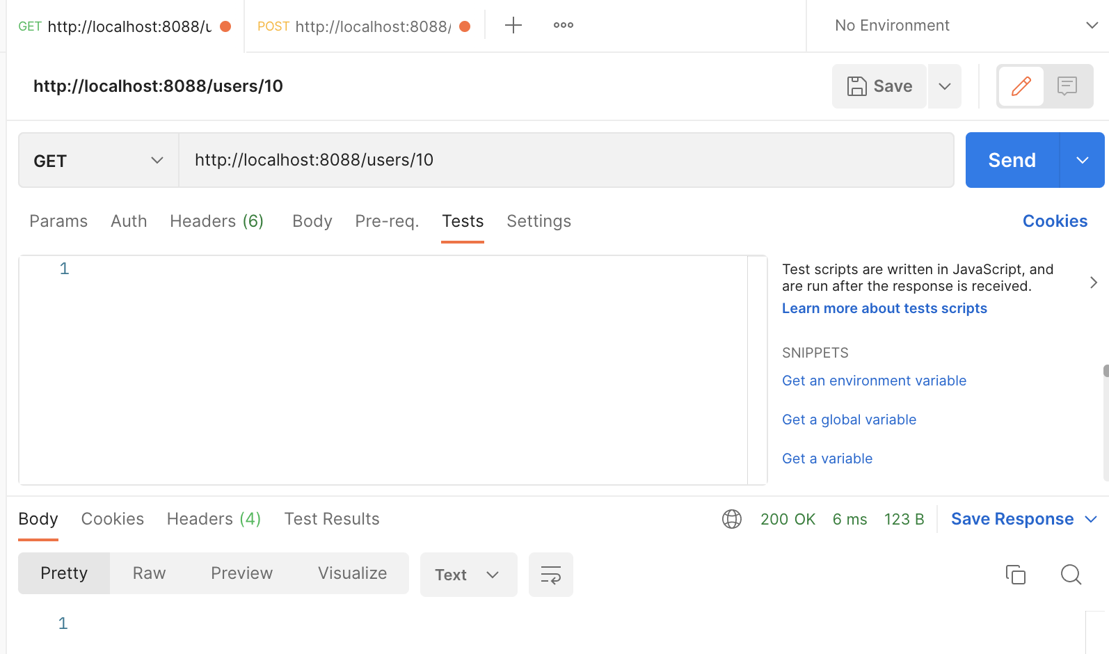 사용자 id는 총 3번까지만 있는데 존재하지 않는 10번의 사용자를 검색해도 200 OK로 떨어진다. 컨트롤러와 서비스의 코드는 아래와 같다.