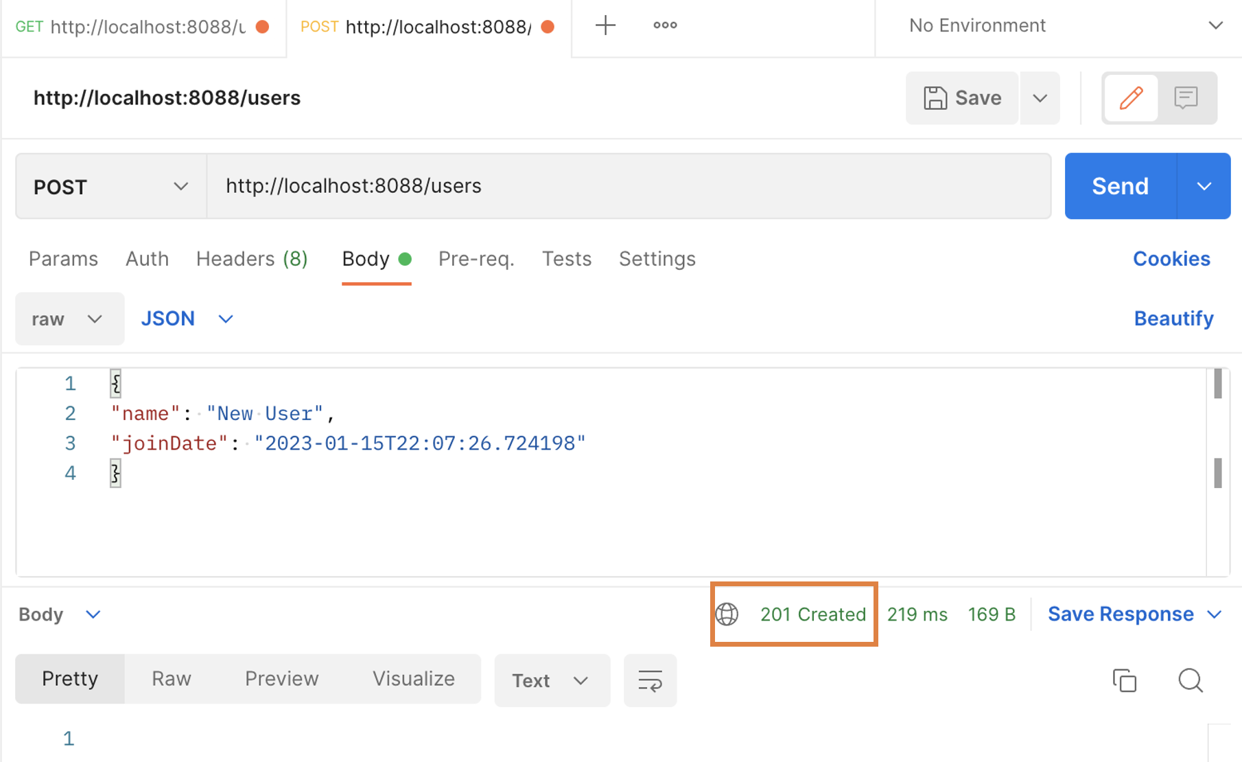 포스트맨에서 새 사용자를 추가하면 응답 코드로 200이 아닌 201 Created가 보인다. 이렇게 서버로부터 요청 결과 값에 적절한 상태 코드를 반환시켜 주는 것이 좋은 REST API를 설계하는 방법이다.
