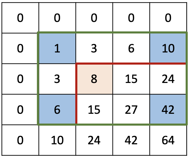 다만 S[1,1]은 S[1,4]와 S[3,1] 구간 합 계산에 모두 쓰였으므로 계산이 중복되었다. 구간 합을 채울 때와는 다르게 중복된 값을 두 번 소실했으니 한 번 채워줘야한다. 그래서 결론은 42 - 10 - 6 + 1 = 27이 된다. 이것 또한 프로그래밍적으로 나타내보자면...