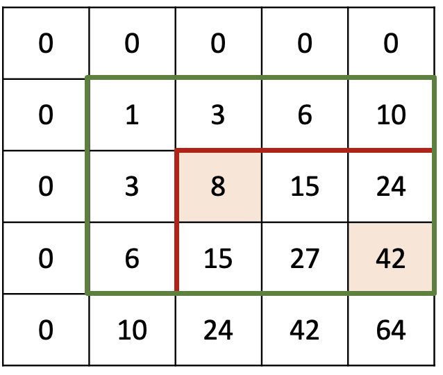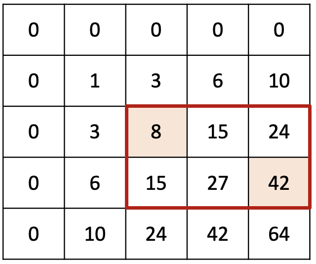 다만 S[1,1]은 S[1,4]와 S[3,1] 구간 합 계산에 모두 쓰였으므로 계산이 중복되었다. 구간 합을 채울 때와는 다르게 중복된 값을 두 번 소실했으니 한 번 채워줘야한다. 그래서 결론은 42 - 10 - 6 + 1 = 27이 된다. 이것 또한 프로그래밍적으로 나타내보자면...