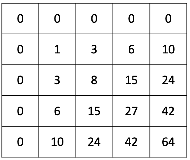 S[i][j] = S[i-1][j] + S[i][j-1] - S[i-1][j-1] + A[i][j]