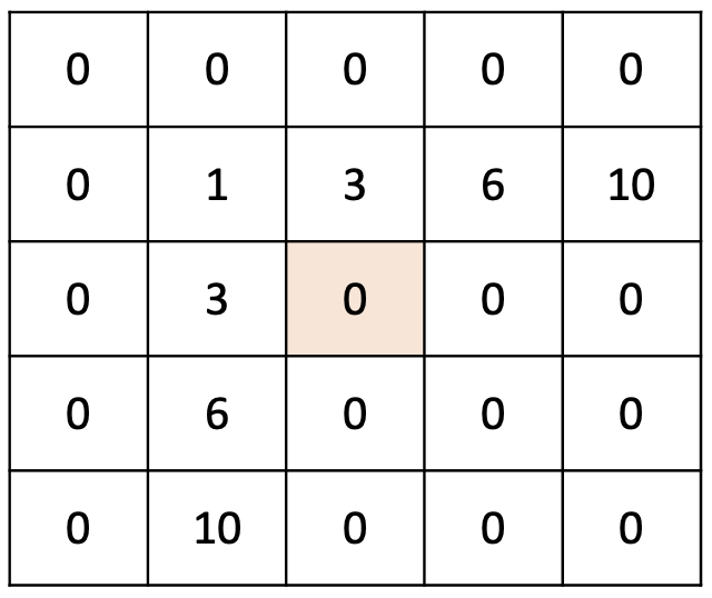저 주황색 칸 기준으로 왼쪽 칸의 값 + 윗쪽 칸의 값 - 중복된 대각선 칸의 값 + 원본 주황색 칸의 값으로 안에 들어갈 값을 계산할 수 있다. 중복된 대각선이란 주황색 칸 왼쪽, 윗쪽 칸은 구간 합 계산이 되어있는 값이기 때문에 1이 총 두 번 계산되어 중복되었다고 표현했다... 좀 더 프로그래밍적으로 정리해보자면...