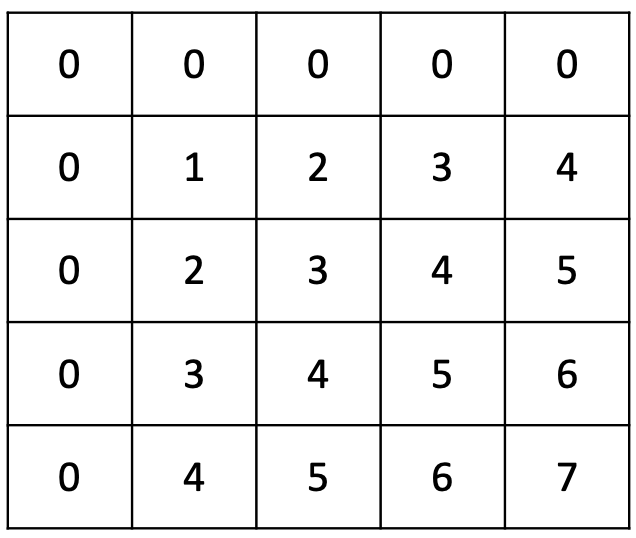 그 다음 배열 자리엔 S[1,1]의 값인 1과 A[1,1]의 값인 2를 더한 값이 들어가야한다. 이런식으로 테두리를 채워보면 아래와 같다.