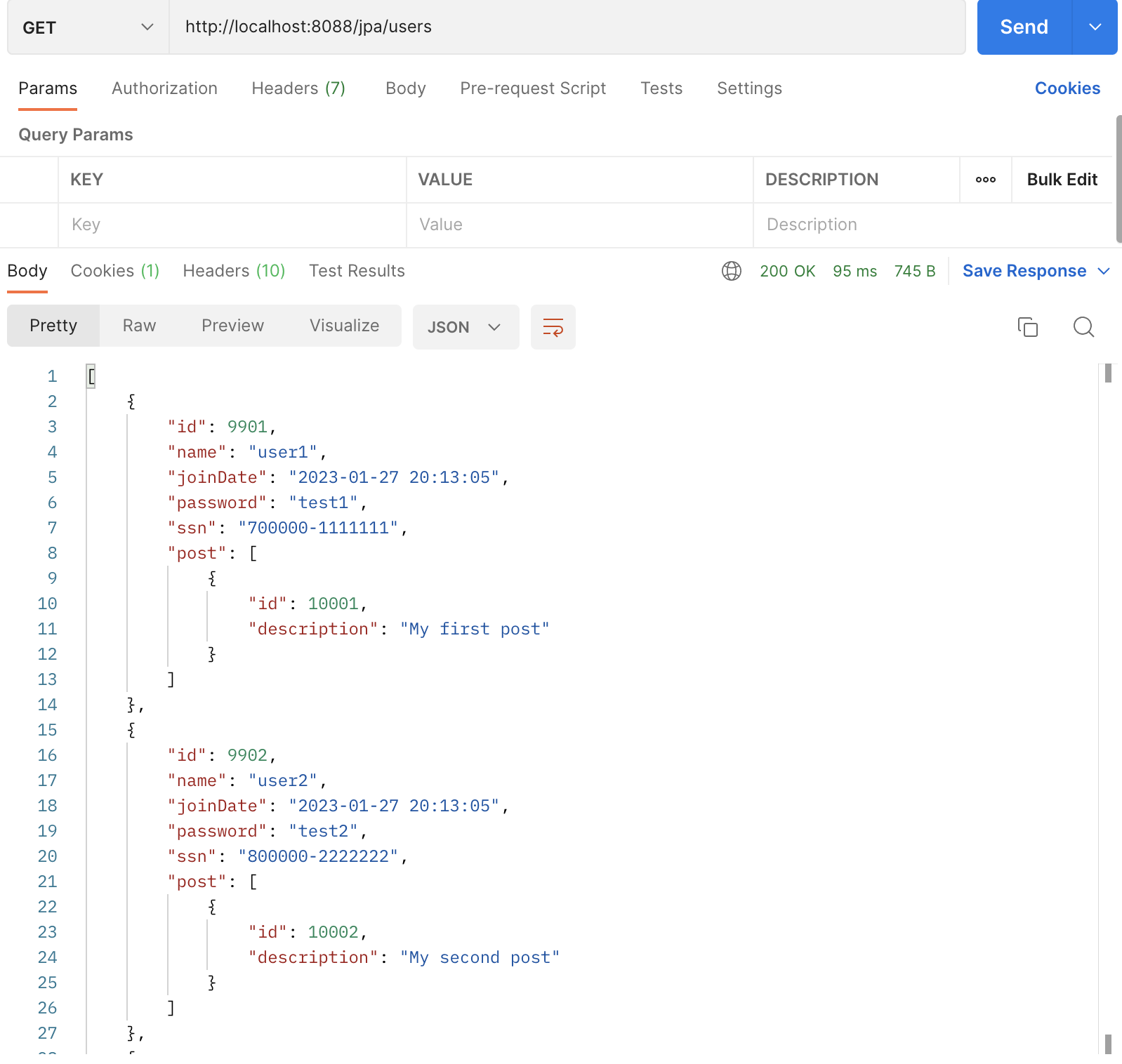 전체 사용자 목록 조회 시에도 Post 데이터를 확인할 수 있다.