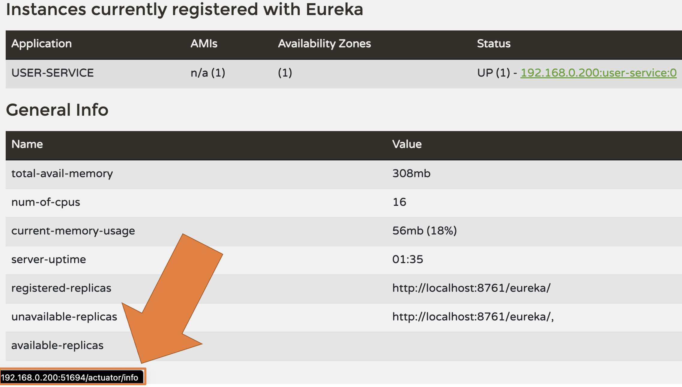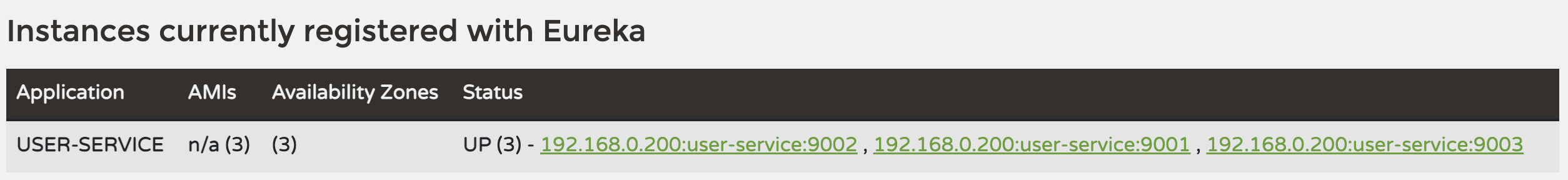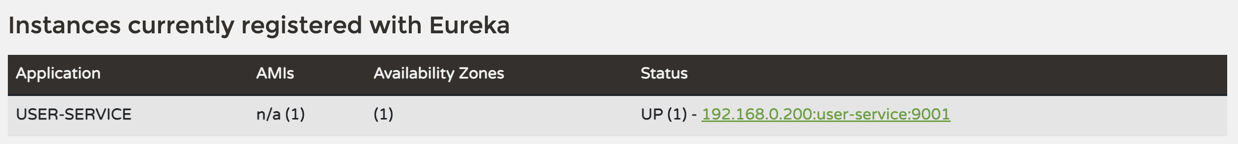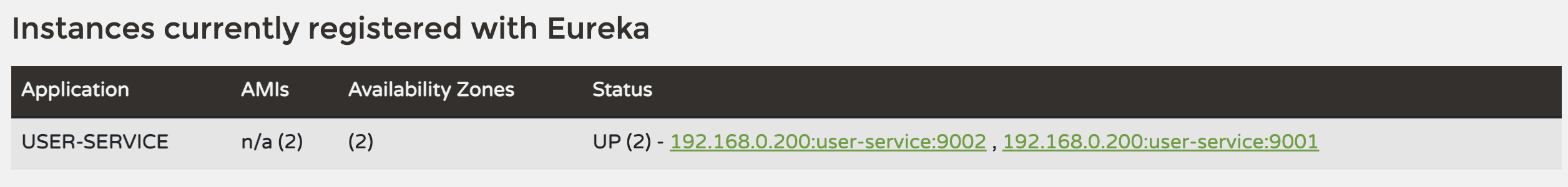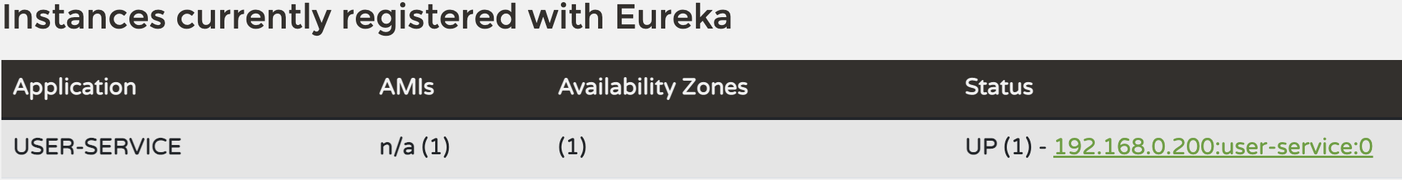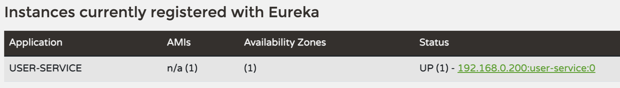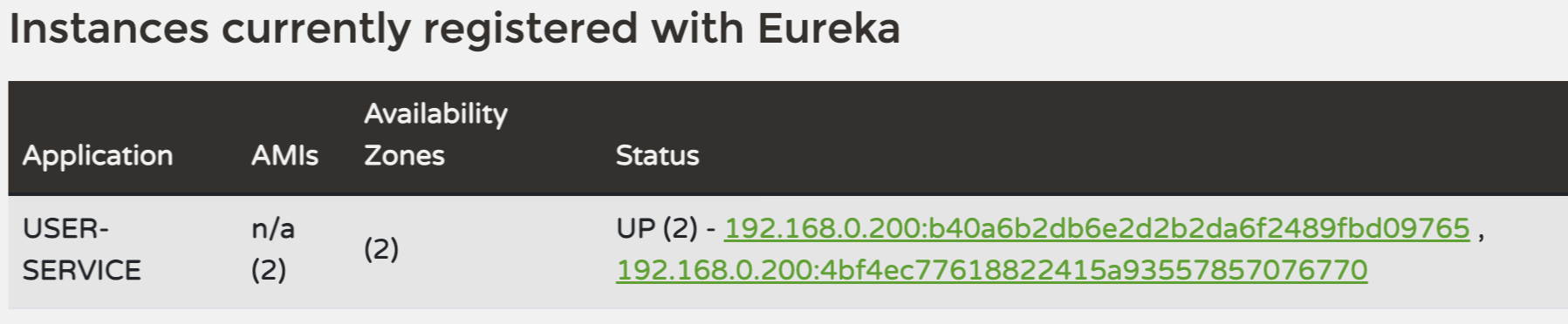 Eureka 대시보드로 접속한다. User Service 관련 두 개의 정보가 보인다.