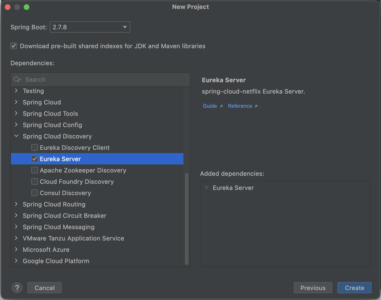 Dependencies에서 Spring Cloud Discovery > Eureka Server를 선택한다.