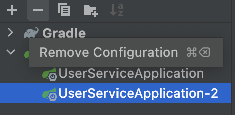 서버를 실행하기 전에 쓸모 없어진 UserServiceApplication-2를 삭제해 주자. UserServiceApplication-2 클릭 후 '-' 아이콘을 누르면 삭제된다.