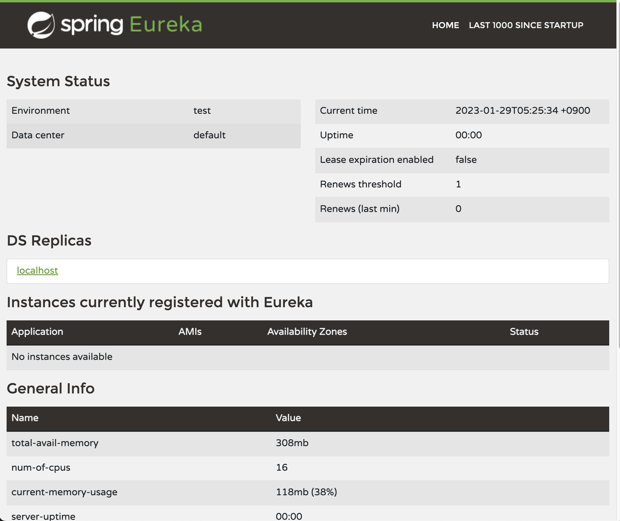 서버 실행 후 크롬에서 127.0.0.1:8761로 접속하면 Eureka의 대시보드를 확인할 수 있다.
