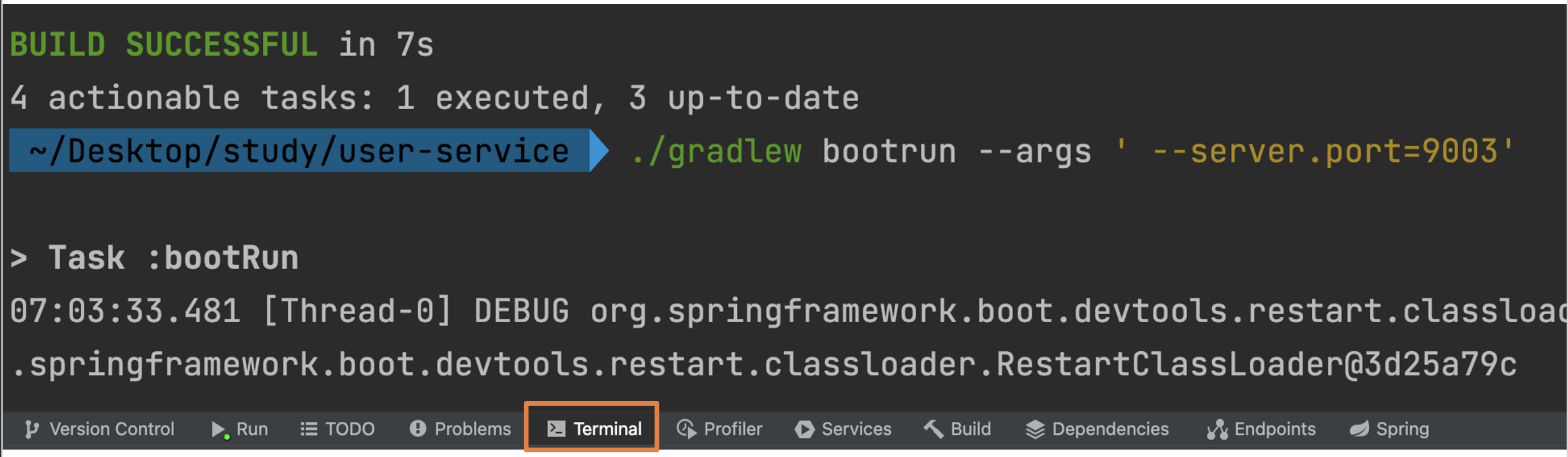 중요한 건 ' --server.port=9003'의 앞쪽 공백을 꼭 넣어주어야 한다.