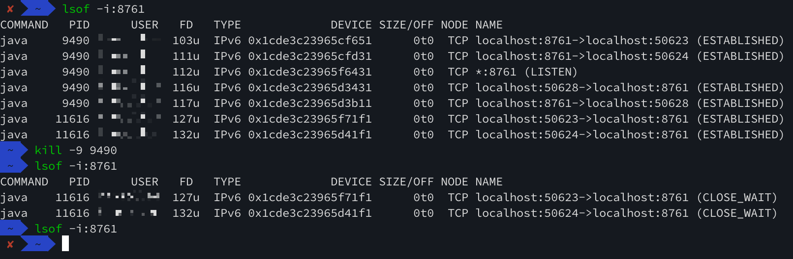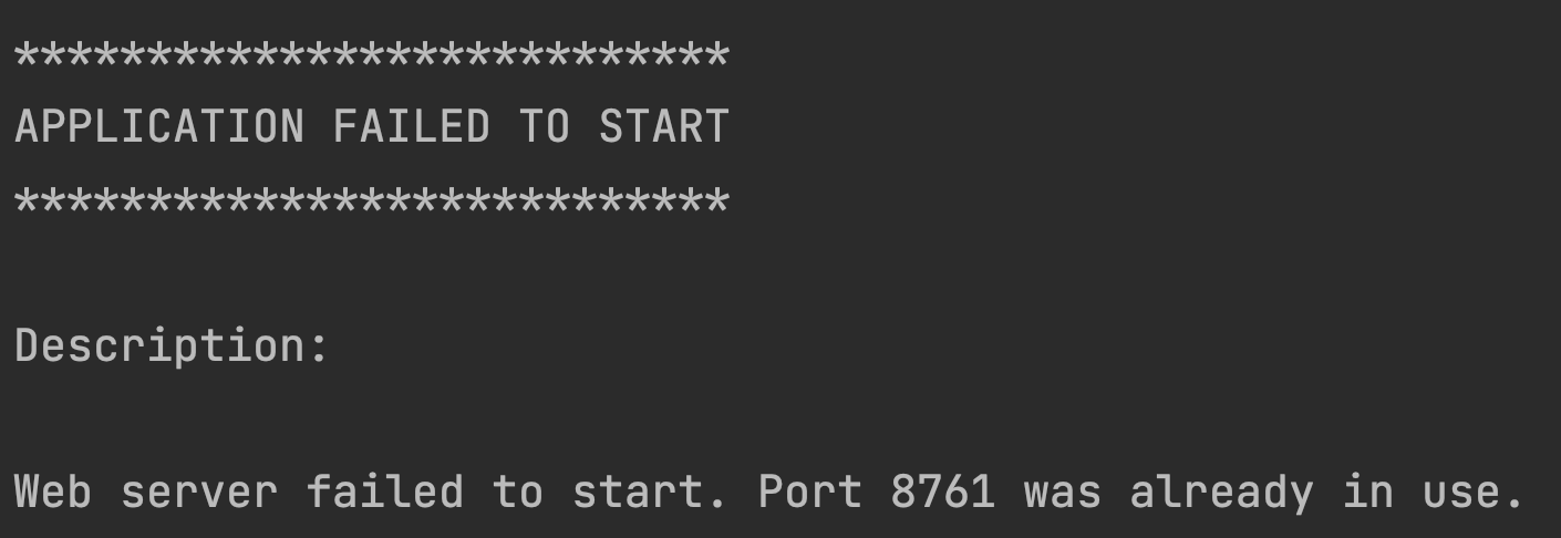 이미 8761 포트를 사용하고 있다는 에러가 발생했다. 프로젝트 분명히 잘 껐는데 뭐지........ 할 수 없이 8761 포트를 사용하고 있는 프로세스를 터미널에서 k i l l 해줬다.