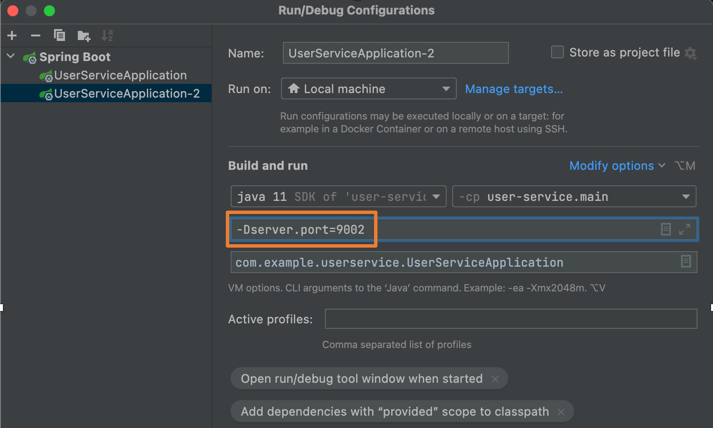 주황색 박스 안에 '-Dserver.port=9002'를 적어주면 된다. 그러면 UserServiceApplication-2를 실행할 땐 9002 포트로 실행된다.