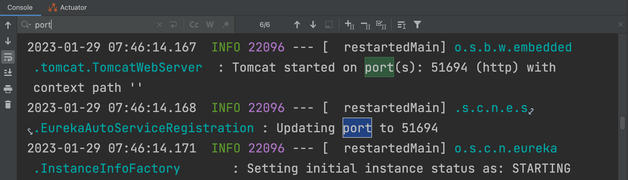 서버를 실행하고 console에 port를 검색하면 랜덤으로 배정받은 port 번호가 나온다.