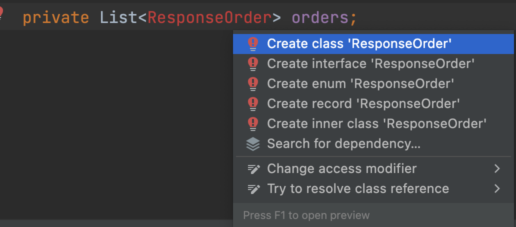 ResponseUser vo에 회원 주문 목록을 볼 수 있도록 필드를 하나 추가한다. 아직 ResponseOrder vo를 만들지 않아 빨간 줄이 뜨는데 mac 기준 커맨드 + 엔터 단축키를 입력하고 Create class 'ResponseOrder'를 클릭하면 해당 vo 클래스를 생성할 수 있다.