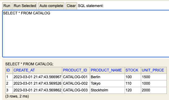 values('CATALOG-002', 'Tokyo', 110, 1000);