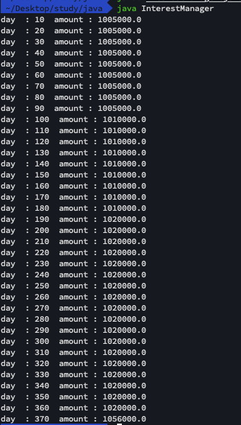 System.out.println("day : " + i + " amount : " + result);