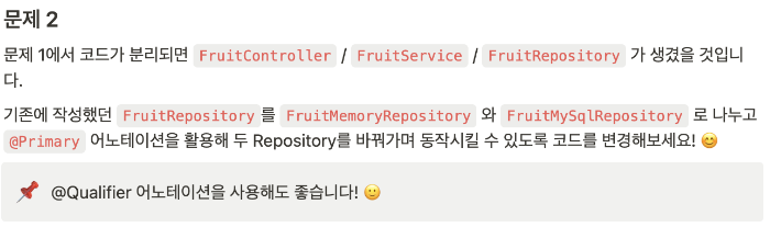 그리고 필드 및 생성자로 FruitMysqlRepository 구현체를 주입받았다. 이 부분은 문제 2에서 변경될 예정이다.