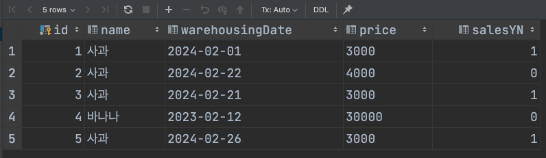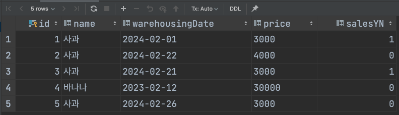 save()에서 매개변수로 받아오는 FruitSaveRequest의 필드가 name, warehousingDate, price 세 개인데 Fruit domain에 warehousingDate가 빠져있고, save() 개발시 필요한 id, name, price, warehousingDate 세 개의 매개변수를 가진 생성자도 만들어줬다. 그리고 update()를 위해 salesYN에 대한 setter를 만들어주었다.