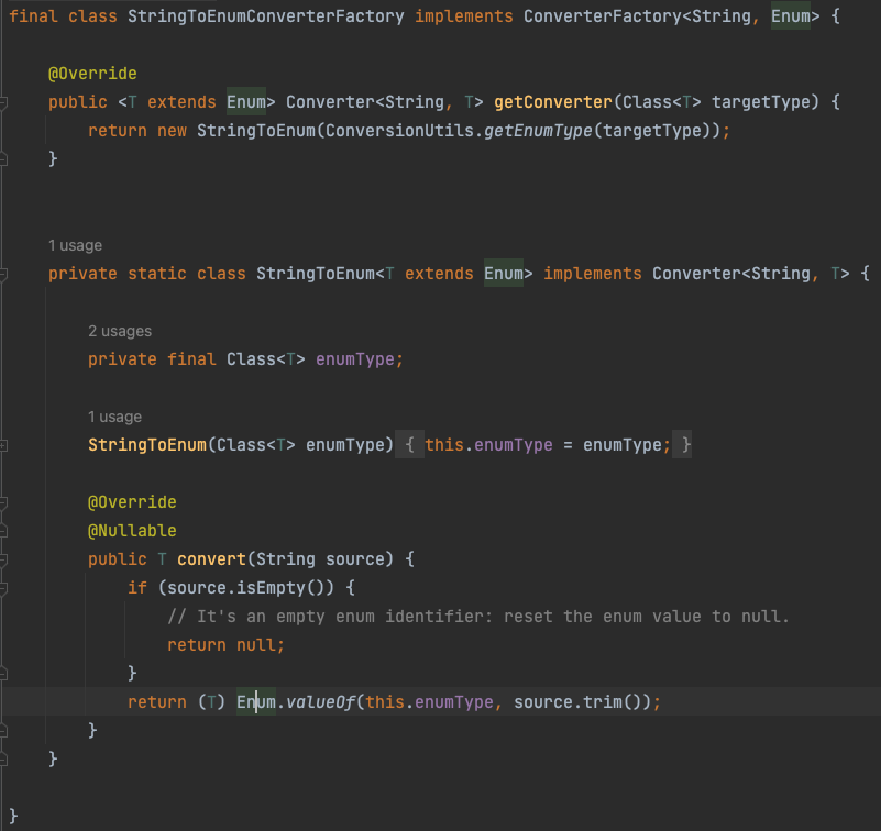 스프링에서 제공하는 StringToEnumConverter가 아래와 같이 동작하기 때문이다.