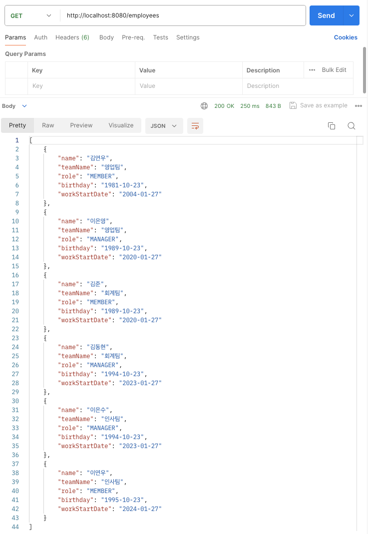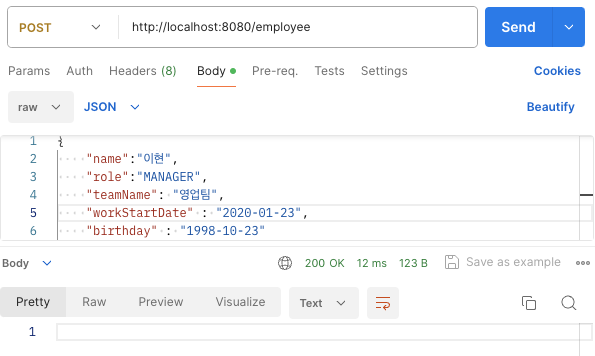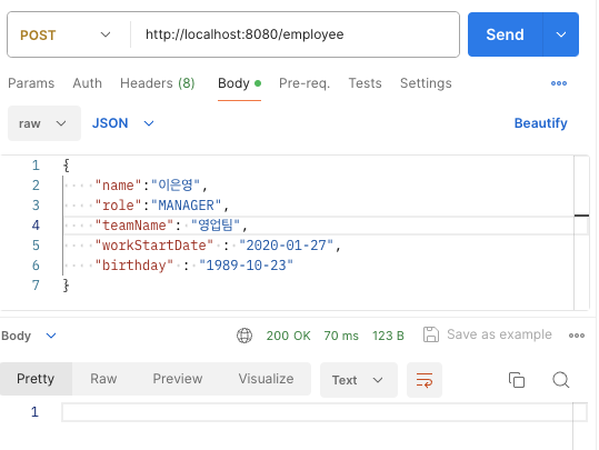 - HTTP Param > body, String name, String role, String temaName, LocalDate workStartDate, LocalDate birthday