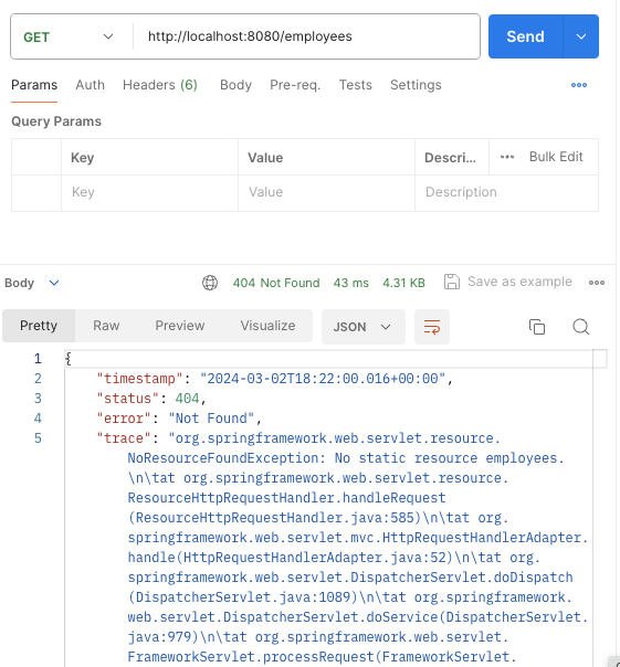 컨트롤러를 확인해보니 클래스 레벨에 @RequestMapping("/employee")를 냅다 써버려서 요청 url를 받아들이지 못한거였다. 수정하고 다시 조회!